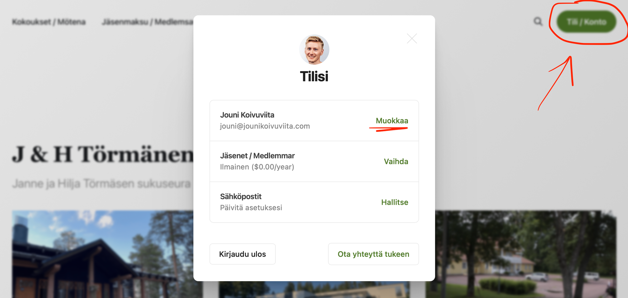 Kun olet kirjautunut, voit halutessasi päivittää nimesi ja sähköpostiosoitteesi klikkaamalla Tili-painiketta (oikea ylänurkka). / När du är inloggad kan du uppdatera ditt namn och din e-postadress om du vill genom att klicka på Konto-knappen (övre högra hörnet).